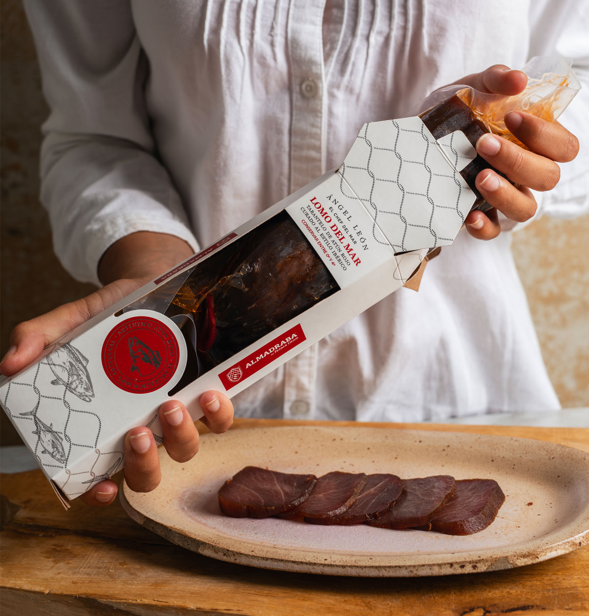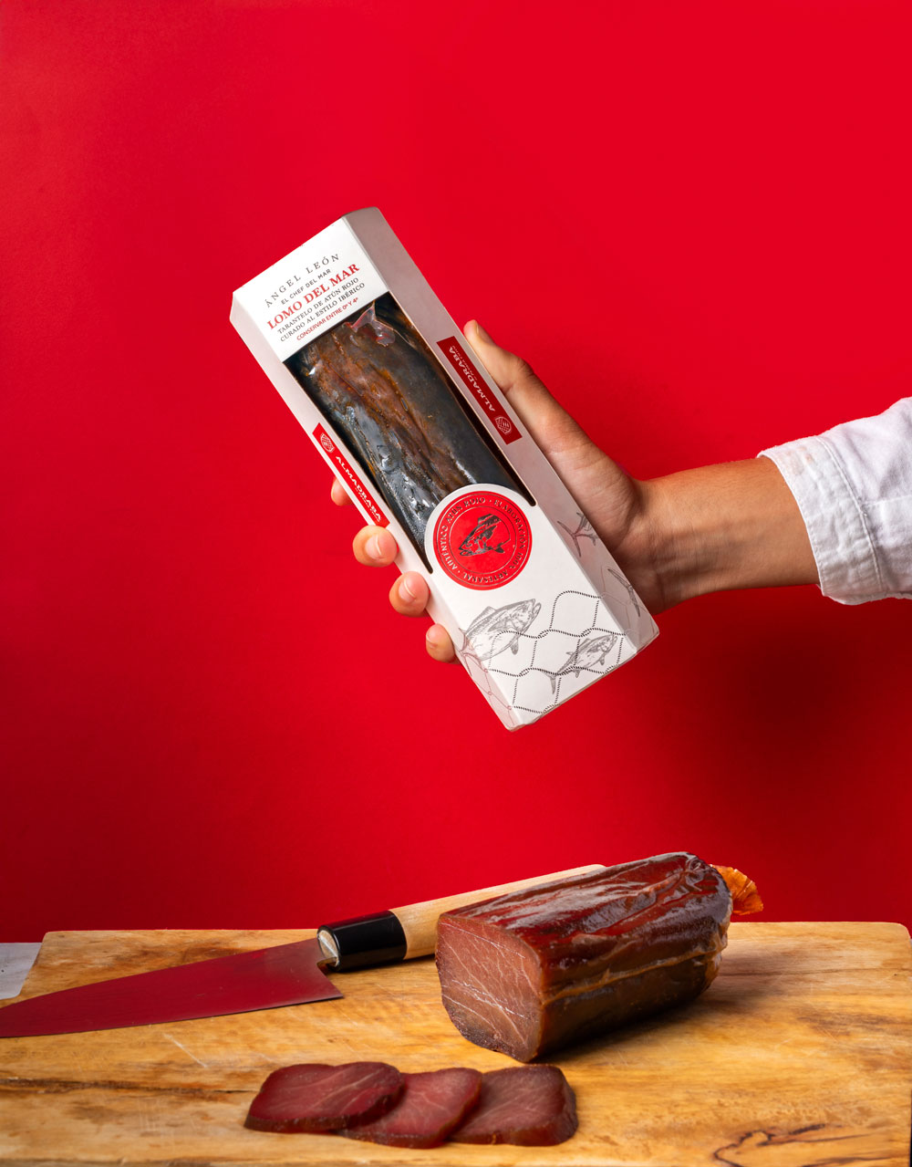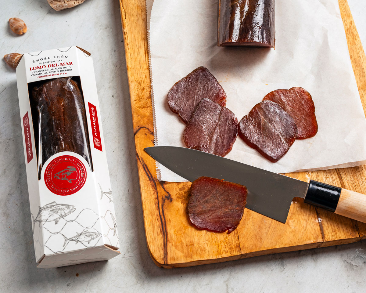 Medio lomo de tarantelo de atún rojo al estilo ibérico, elaborado artesanalmente con sal, especias y embuchado en tripa natural. Cada pieza se somete a un estricto control de frío para preservar todas las cualidades del atún rojo y su sabor equilibrado. Ideal para disfrutar directamente o preparar platos donde el lomo de atún sea el protagonista.